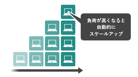 オートスケーリングを採用することで、負荷に応じて、PCのスペックを柔軟に変更できるため、負荷が低いときは低スペックのPCを、負荷が高いときは高スペックのPCになり、コストが最適化されます。